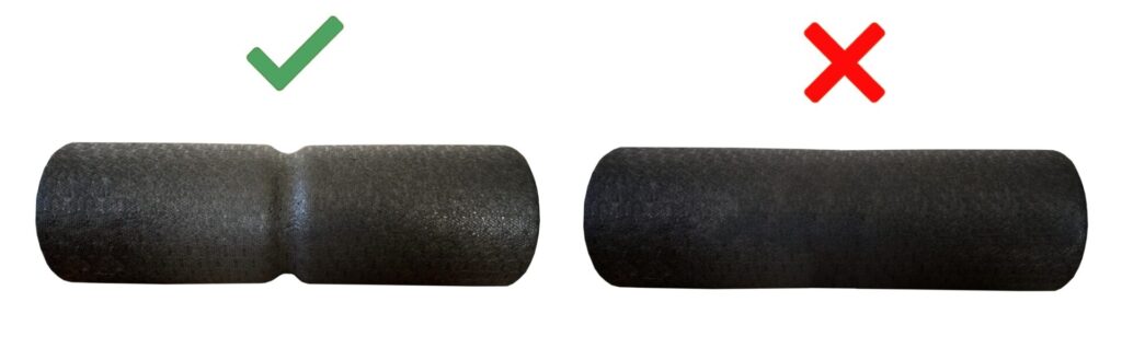 | Wirbelsäulenfreundliche Rolle verwenden Nutze eine rückenfreundliche Faszienrolle, die in der Mitte eine Mulde hat, um unnötigen Druck auf die Knochenvorsprünge der Wirbelsäule zu vermeiden. | Glatte Rolle ohne Mulde in der Mitte verwenden Dabei werden die Knochenvorsprünge der Wirbelsäule belastet, während der Druck auf die Muskeln direkt daneben verringert wird. |